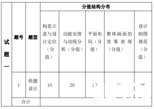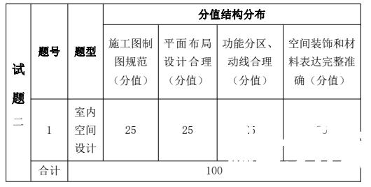 第二部分:室内空间设计主要考核考生对室内平面的空间功能布置设计,同时也包括对室内立面功能布置设计能力的展现,通过考生的专业制图水平,以及整个设计图纸中设计图形与版式的整体计划能力,cad 计算机软件应用能力。重在考核考生是否会按照国家颁布的建筑设计制图标准绘制建筑室内外环境设计图纸的能力,以及考生对建筑室内外环境设计中的装饰材料、装修作法掌握程度的了解,尺寸、标高、材料与作法的标注及细部的处理等。