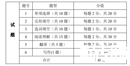 3、本部分的得分占总分的 50%,与英语 A 级难度相当。选择题和完形填空题型与英语 A 级一致,选词填空与参考书目每个单元 Vocabulary Building 部分课后习题选词填空题型一致。