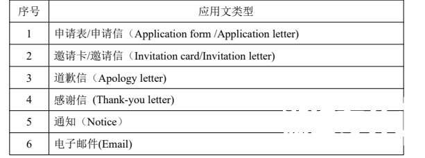 测试考生写应用性短文、信函、邮件,填写英文表格或翻译简短的实用性文字的水平。考生写作应注意要素齐全、格式正确、思想表达准确、意义连贯、无严重语言错误。
