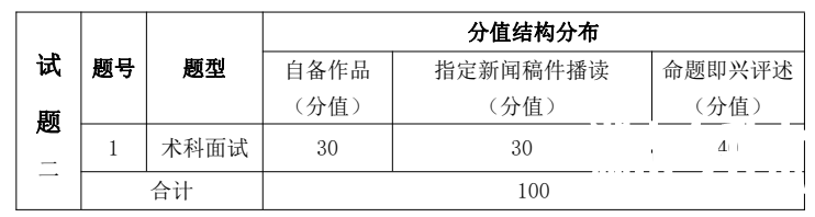 1.自备作品朗诵(朗诵体裁不限,如:现代诗歌、散文、寓言、台词、小说片段等,时间在 2 分钟以内),考查学生普通话水平与稿件创作综合能力;2. 指定新闻稿件播读,考查学生备稿能力,对新闻稿件的理解能力以及语言的综合运用能力;3.命题即兴评述,(考生抽题后评述,时间在 3 分钟以内),考查学生的逻辑思维能力、语言组织、表达能力以及一定的文化素养。