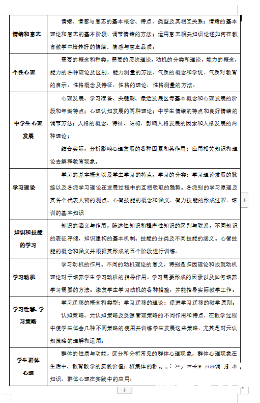 心理学考试大纲严格遵照本课程教学大纲执行,要求学生掌握心理学基础知识,能够初步运用心理学基本理论解读教育教学现象和解决教学实践中出现的基本问题。重点考核心理学的基本知识、基本理论以及学生认识问题、分析问题和解决问题的能力。