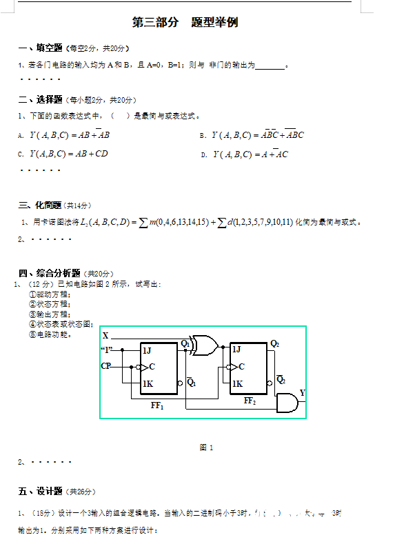 考核知识点: 组合电路的分析与设计方法、常用组合逻辑器件编码器、译码器、数值比较器、全加器、数据选择器的功能及应用。