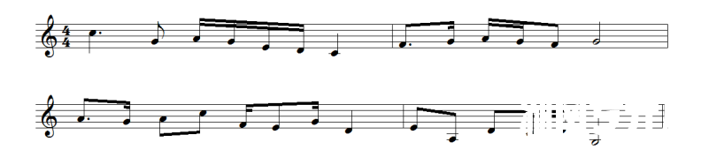 五线谱视唱:C大调、a小调、C宫系统调,节拍范围为2/4拍、3/4拍、4/4拍,以常见的节奏形态与流畅的旋律进行为主要内容,并应掌握附点音符、切分音三连音、休止符、音程大跳(八度以内)及经过与辅助等形式的变化音。