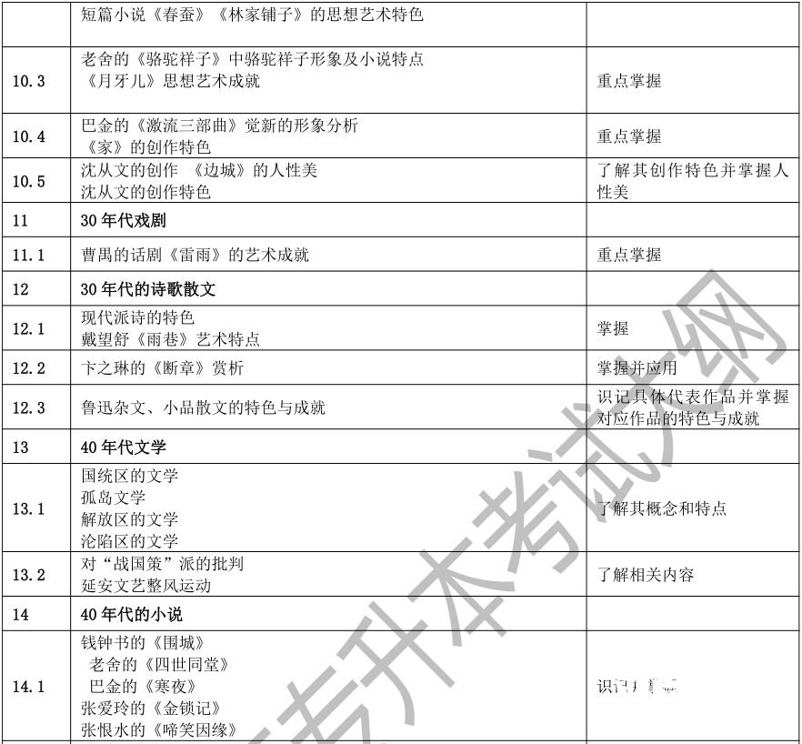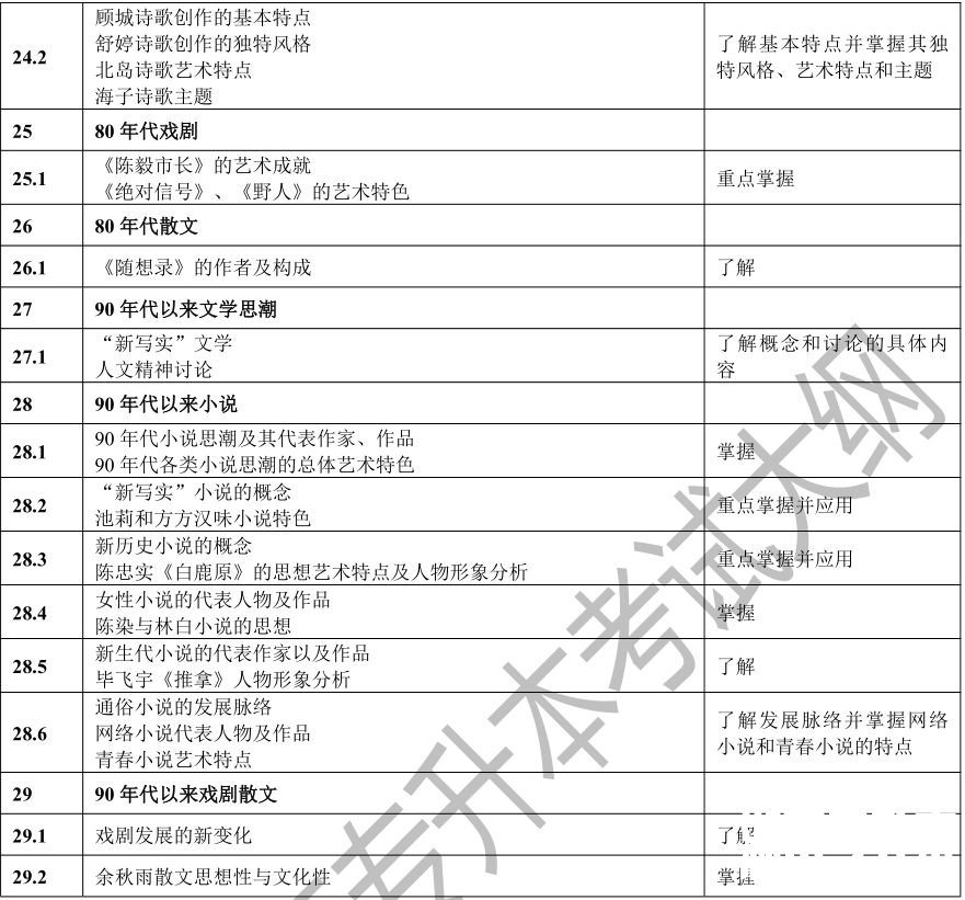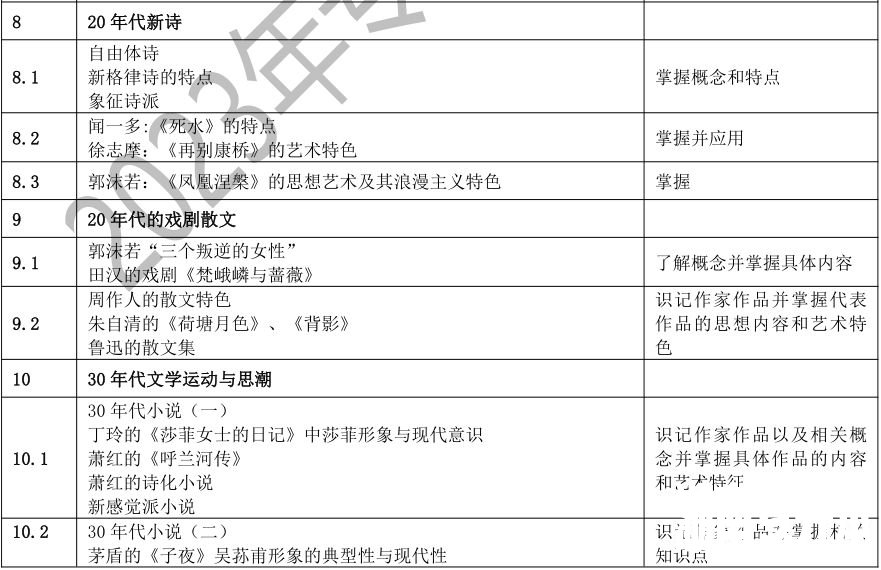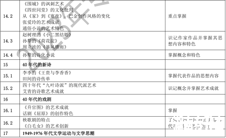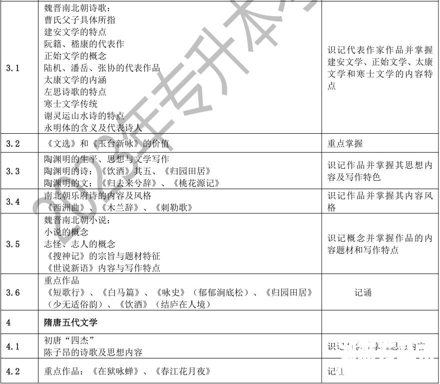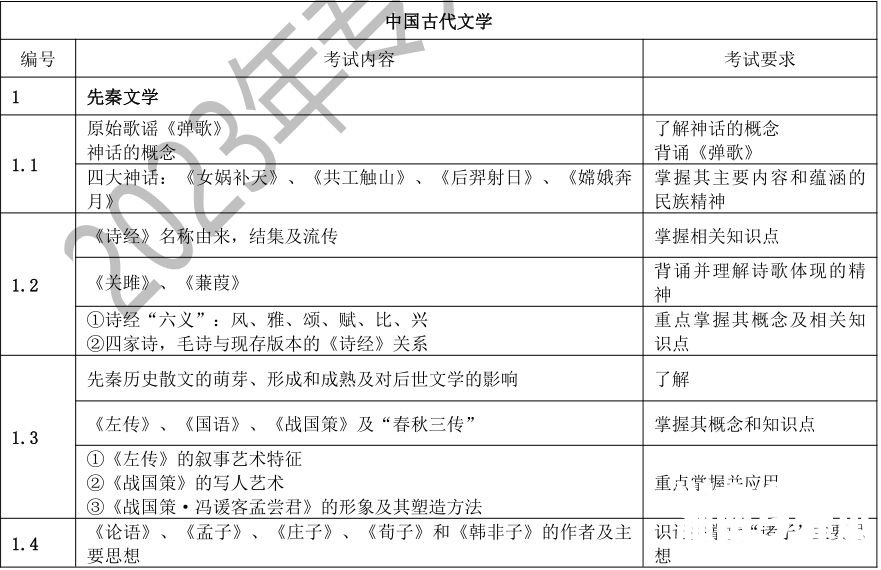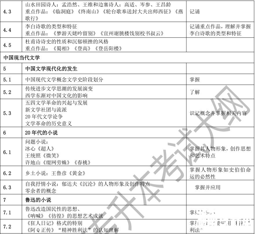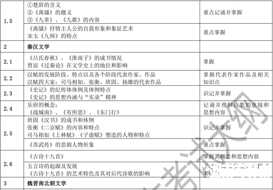 要求考生系统地了解中国文学的发展脉络,了解中国文学史上重要的作家、作品、文学思潮、文学流派、突出的文学现象等,以及其在文学史上的地位和影响。考生应该具有对代表作品的阅读、理解、分析和评价能力,并能够诵记名篇名句,达到本科阶段学习所需要的素质、知识和能力基本要求。