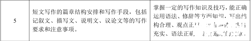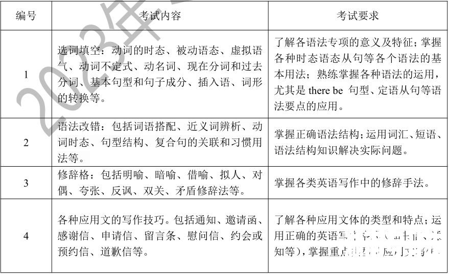 要求考生能系统地理解《英语写作》课程的基本知识点。能在 40 分钟内根据作文题目、提纲或图表写出长度为 120 单词左右的短文,内容切题,结构严谨,条理清楚,语法正确,语言通顺,表达得体。同时还能根据提示,在 30 分钟内写出长度为 70 个单词左右的应用文,如便条。此外,要求考生掌握修辞格、各种文体及其篇章结构,如描写文、记叙文、说明文和议论文等。