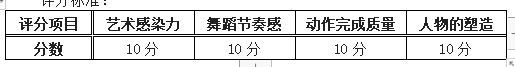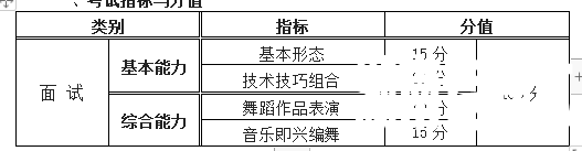考试内容:6名考生为一组,轮流上场。考评员目测考生进行音乐即兴编舞考试。要求动作优美合理,音乐与动作融合具有一定的艺术表现力。