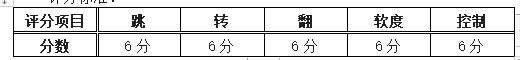 考试内容:考生在3分钟内完成组合,应包含跳、转、翻、软度、控制5项内容,能够充分展示个人综合能力的技巧。