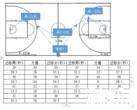 成绩评定细则:学生从篮筐下方端线起步运球绕第一立柱传球给立柱对面中线与边线交叉点的接球者,然后跑步绕过第二立柱,接回传球运球绕过第三立柱右手上篮,进球后抢到篮板球运球从原路线返回、绕过第三立柱传球给接球者、跑过第二立柱,接回传球运球绕过第一立柱采用左手上篮。以全场来回运球、传球进行计时的方法进行考核。要求分别以左右手上篮,没投中必须补中篮,共两个来回投4次篮。启动开始开表计时,最后一次上篮中篮停表。采用达标和技评相结合的方法评定成绩。每人测试两次取其中最好成绩为准(达标满分分值为30分)