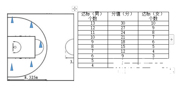以篮球中心投影点为中心,5.5米为半径所画的弧线上,设置5个投篮点,(两侧0度角,两侧45度角。正面弧顶)每个点放置5个球,共25个球。任意点开始投篮后按顺时钟或逆时针方向每投一次换一个投篮点。测试时间为一分钟。每人测试两次、取其中最好成绩为准。(达标满分分值为30分)
