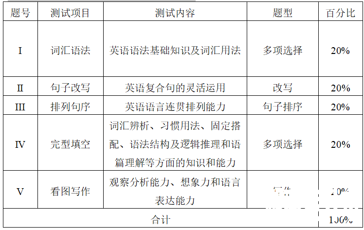 总分100分。试题包括五个部分:词汇语法,句子改写,排列句顺,完型填空,看图写作。