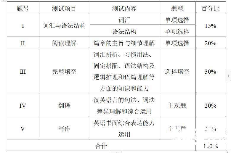 总分100分。试题包括五个部分:词汇与语法,完形填空,阅读理解,翻译,写作。
