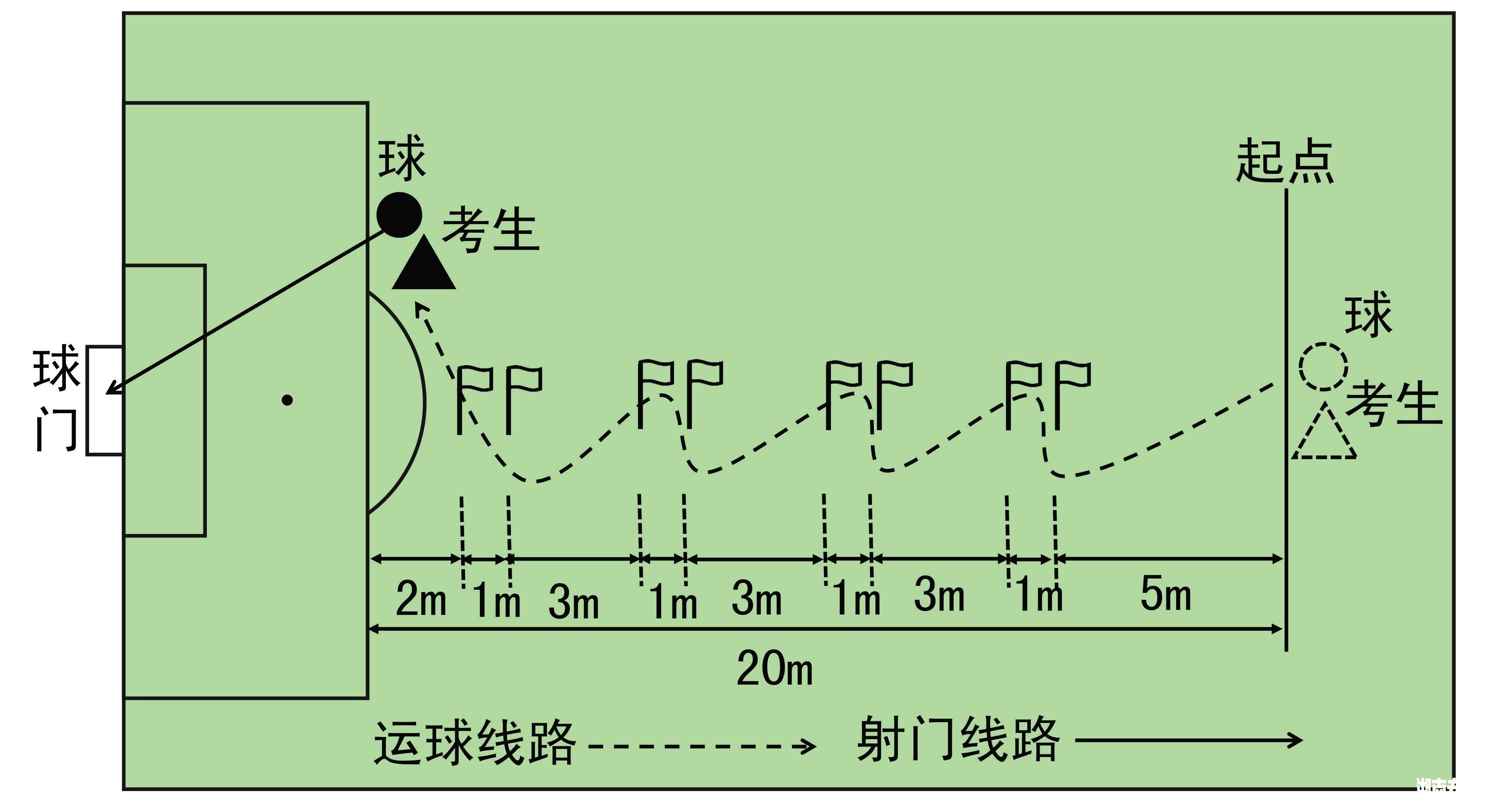 (1)考试方法:如图 2-2 所示,从罚球区线中点垂直向场内延伸至 20 米处,画一条平行于球门线的横线作为起点线。距罚球区线 2 米处起,沿 20 米垂线共插置 8 根标志杆。考生将球置于起点线上,运球依次绕过 8 根标志杆后起脚射门,球动开表,当球从空中或地面越过球门 线时停表,记录完成的时间。凡出现漏杆、射门偏出球门,球击中横梁或立柱弹出,均属无效, 不计成绩。每人测试 2 次,取最好成绩。