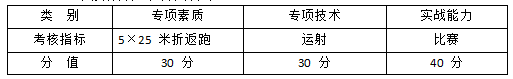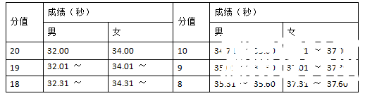 (1)考试方法:考生从起跑线向场内垂直方向快跑,在跑动中依次用手击倒位于 5 米、10 米、15 米、20 米和 25 米各处的标志物后返回起跑线,要求每击倒一个标志物须立即返回一次,再 跑到下一个标志物,以此类推。考生应以站立式起跑,脚动开表,完成所有折返距离回到起跑 线时停表,记录完成的时间。未击倒标志物,成绩无效。每人测试 1 次。