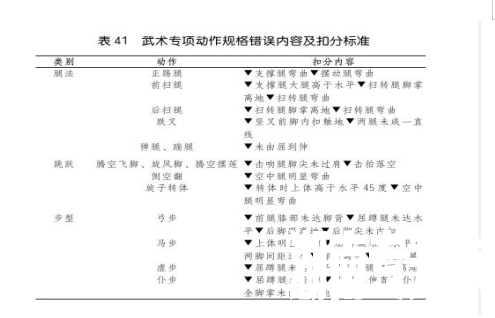 运动员现场完成套路时、动作规格与要求不符则扣相应分值(见表41);出现移动、晃动、跳动、遗忘,每一次扣0.1分、附加支撑一次扣0.2分、倒地扣0.3分。(注:动作规格错误内容及扣分标准参照《2005年国际武术竞赛规则》)