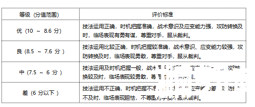 (2)评分标准:参照实战能力评分细则,对考生在实战中的胜负、临 场技战术运用情况、意志品质以及对散打竞赛礼节的遵守等方面进行综合评定。采用 10 分制评分,所打分数至多可到小数点后 1 位。
