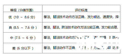 (4)评分标准:主要对考生的动作规格、劲 力协调、攻防意识等方面进行综合评定。采用 10 分制评分,所打分数至多可到小数点后 1 位。 每漏做一种技术动作扣 2 分。