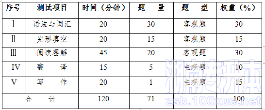 (2)测试考生运用语法知识和词汇的能力。重点考查主从复合句、非谓语动词、虚拟语气、倒装、反义疑问句、时态和语态、词组搭配、词义辨析等。题型为单项选择题。