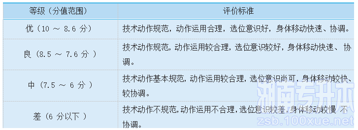 (2)评分标准:考评员参照扑接球评分细则(表6),独立对考生进行技术技能评定。采用 10 分制评分,分数至多可到小数点后1位。