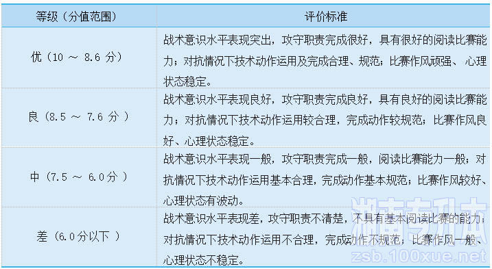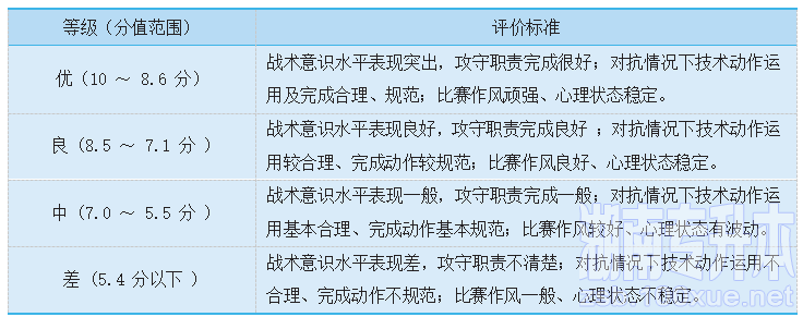 2. 评分标准 :考评员参照实战能力评分细则(表7),独立对考生的技术能力、战术能力、心理素质以及比赛作风等方面行综合评定。采用10分制评分,分数至多可到小数点后1位。