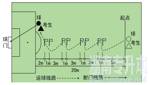 (1)考试方法:如图2 所示,从罚球区线中点垂直向场内延伸至 20 米处,画一条平行于球门线的横线作为起点线。距罚球区线 2 米处起,沿 20 米垂线共插置 8 根标志杆。考生将球置于起点线上,运球依次绕过 8 根标志杆后起脚射门,球动开表,当球从空中或地面越过球门线时停表,记录完成的时间。凡出现漏杆、射门偏出球门,球击中横梁或立柱弹出,均属无效,不计成绩。每人测试 2 次,取最好成绩。